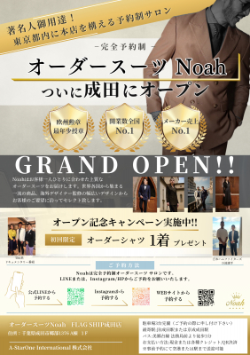 A-StarOne International株式会社(代表取締役:坂本大地)は、完全予約制のオーダースーツブランド『Noah』の旗艦店「Noah FLAG SHIP成田店」を、2025年5月6日にグランドオープンいたしました。