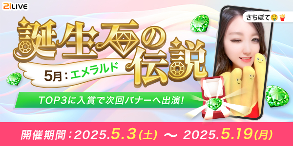 株式会社エムアンドティーティー(本社:沖縄県北谷町、代表取締役:井藤 三知子)が運営するエンターテイメント・ライブ配信アプリ【21LIVE(ニーイチライブ)】URL: https://21.live では、5月3日(土)より『誕生石の伝説』を開催します。