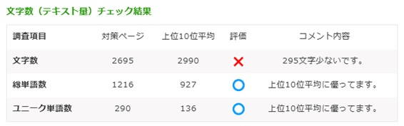 文字数カウントとは、Webサイトのコンテンツ(ブログ記事)の「文字数(テキスト量)」「総単語数」「ユニーク単語数」を競合上位10位平均と比較チェックし、評価する無料SEOツールです。
