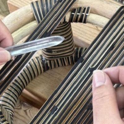 伝統工芸としての趣がありながら、現代生活に馴染む美観と実用性を兼ね備えた「籐うちわ・籐扇子」。手がけたのは「木内籐材工業」の三代目木内 秀樹さんです。木内籐材工業が、籐の敷物製作を始めたのは1931年(昭和6年)。以来100年近く、籐をつかった敷物製作、家具製作に携わっています。今回の実演では、籐うちわ・籐扇子の手持ち部分の籐巻きを行います。