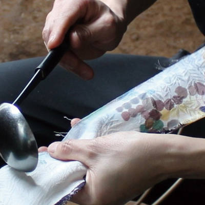 18世紀初頭、中国やヨーロッパから伝来した技術と日本の技術のハイブリッドとして生まれた江戸硝子。伝統技術によりガラス製品を手がける「中金(なかきん)硝子総合株式会社」は、1946年(昭和21年)創業以来、2色のガラスを重ねて吹く「中金色被せガラス」を主に製造、江戸硝子の普及に努めています。職人がつくる二層のガラス「色被せ硝子」を使用し、切子模様を施す実演を行います。