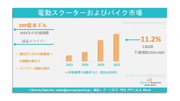Survey Reports LLC は、2025年4月に「電動スクーターおよびモーターサイクル市場セグメンテーション:車両タイプ別(E-スクーター/モペッド、E-モーターサイクル)、バッテリータイプ別(密封型鉛酸、リチウムイオン、その他)、航続距離別(75マイル未満、75マイルから100マイル、100マイル超)、車両クラス別(エコノミー、ラグジュアリー)、用途別(商用、個人用)」に関する調査報告書を発行したことを発表した。出力別(3kW未満、3kW~5kW、5kW超)、車両クラス別(エコノミー、ラグジュアリー)、用途別(商用、個人用)-グローバル市場分析、動向、機会、予測(2025年~2035年)をまとめたものです。このレポートでは、電気スクーターおよびモーターサイクル市場における成長要因、市場機会、課題、脅威を含む、複数の主要な市場動向を強調している。