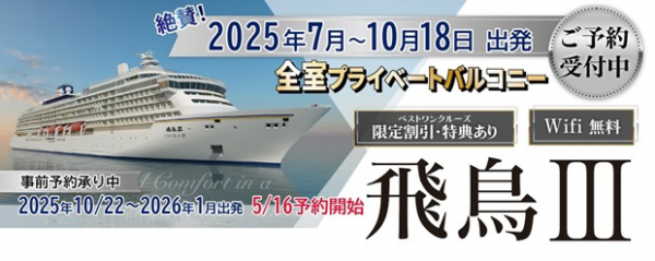 クルーズ予約サイト「ベストワンクルーズ」運営の株式会社ベストワンドットコム(本社:東京都新宿区、代表取締役:澤田秀太、野本洋平)は、「飛鳥III」の2025年10月~2026年1月出発クルーズの新スケジュールが発表されましたので、本日より事前相談、予約希望受付を開始いたします。なお、販売開始は2025年5月16日(金)午前10時30分からとなります。