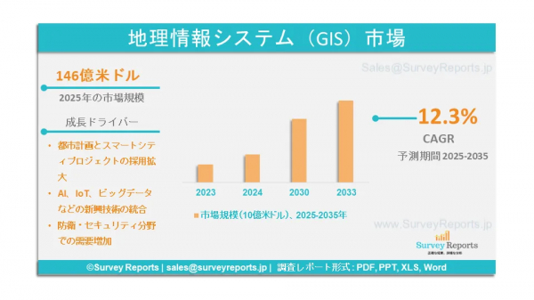 Survey Reports LLC は、2025年4月に「地理情報システム(GIS)市場セグメンテーション(提供内容別(ハードウェア(GIS コレクター、イメージングセンサー、LiDAR、トータルステーション、GNSS/GPS アンテナ)、ソフトウェア(デスクトップ GIS、サーバー GIS、開発者向け GIS、モバイル GIS、リモートセンシングソフトウェア)、サービス)、機能別(マッピング、測量、テレマティクスおよびナビゲーション、 位置情報サービス))、エンドユーザー別(農業、石油・ガス、建築、エンジニアリング、建設、輸送、公益事業、鉱業、政府、医療、小売)、用途別(測量、地図作成、ナビゲーション)、デバイス別(デスクトップ、モバイル)、タイプ別(デスクトップGIS、サーバーGIS、開発者向けGIS、モバイルGIS、その他) - 2025年から2035年までのグローバル市場分析、動向、機会、予測。地理情報システム(GIS)市場の予測評価を提供。地理情報システム(GIS)市場における成長要因、市場機会、課題、脅威など、複数の主要な市場動向を強調している。