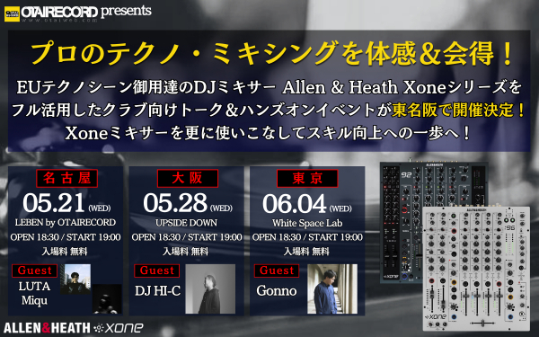 オタイオーディオ株式会社が運営するDJ機材通信販売専門店OTAIRECORD(オタイレコード)がAllen&HeathのDJミキサーXoneシリーズをフル活用したクラブ向けトーク&ハンズオンイベントを東京・名古屋・大阪で開催する。