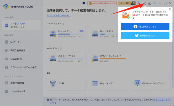 ステップ1.Tenorshare 4DDiG Freeを起動し、復元したいHDDをスキャンします。(初めは500MB無料、SNSへ共有してさらに1.5GBの無料復元量を取得)