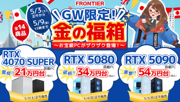 インバースネット株式会社(本社:神奈川県横浜市神奈川区新浦島町1-1-25、代表取締役社長:山本 慶次郎、以下 当社)は、直販サイト「FRONTIERダイレクト」にて、ゴールデンウィーク期間中の特別企画として、「GW限定!金の福箱」を開催いたします。2025年5月3日(土)、4日(日)、5日(月)の各日正午より、3日間で計14商品(3日:6商品、4日:4商品、5日:4商品)を順次販売いたします。
