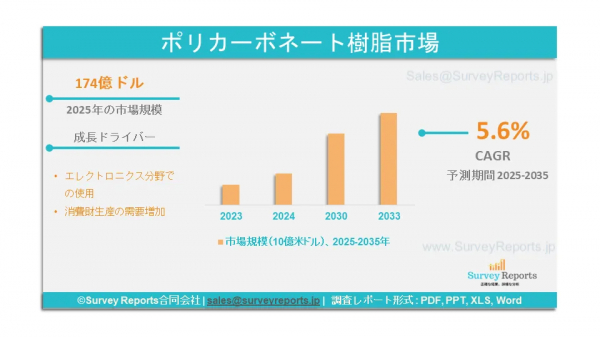 Survey Reports LLCは、2025年4月に「ポリカーボネート樹脂市場セグメンテーション(グレード別(汎用、光学))、用途別(自動車、消費財、レジャー・安全、電気・電子、家庭用家電、光学メディア、医療、包装)、製品別(複合材・樹脂、シート、フィルム、ブレンド)」に関する調査報告書を発行したことを発表した。- グローバル市場分析、動向、機会、および予測(2025-2035年)を発行しました。この報告書は、ポリカーボネート樹脂市場の予測評価を提供し、成長要因、市場機会、課題、および脅威を含む、ポリカーボネート樹脂市場の主要な市場動向を強調しています。