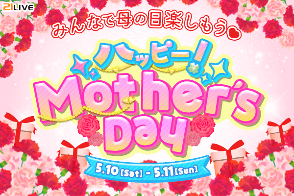 株式会社エムアンドティーティー(本社:沖縄県北谷町、代表取締役:井藤 三知子)が運営するエンターテイメント・ライブ配信アプリ【21LIVE(ニーイチライブ)】URL: https://21.live では、5月10日(土)より『ハッピー!Mother's Day』を開催いたします。