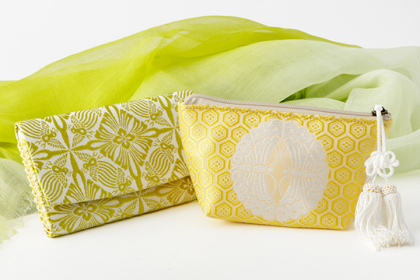 十二単の五衣の織物で作られた色を嗜む巾着袋。巾着袋の紐を絞ることで、裏地の色が見え、表と裏の色の組み合わせは「重色目(かさねいろめ)」を(平安の宮中では色彩を暮らしの中で楽しんでおり、重色目は、装束の表裏の色の組み合わせで季節や個性を表現していました。)、十二単で使われる絹の優しい手触りと雅な平安の趣を感じられます。
