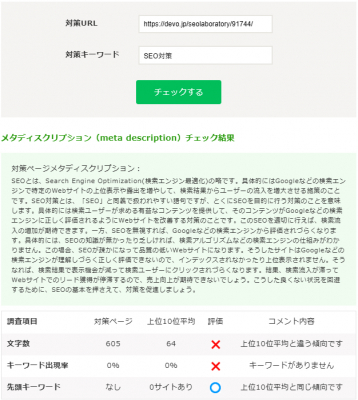 今回公開した「メタディスクリプション評価チェックツール」は、メタディスクリプションの「文字数」「キーワード出現率」「先頭キーワード状況」を競合上位10位平均と比較チェックし、評価する無料SEOツールです。