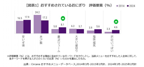 おすすめメニューデータベースは、最近食べた外食・中食メニューの中で、“他の人にもおすすめしたいメニュー”を消費者から収集したデータベースです。2024年の(3-2月計)のおにぎりの評価要素を10年前と比較すると、おにぎりのボリューム感が評価される傾向が強まっていることが分かりました。