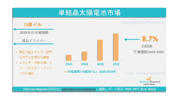 Survey Reports LLCは、2025年5月に「単結晶太陽電池市場セグメンテーション(技術別(Cz-Si技術、Fz-Si技術、HJT技術、IBC技術、ペロブスカイト技術)、用途別(住宅用、商業・産業用、大規模プロジェクト)、出力別(0-100 Wp、101-400 Wp、 401-1000 Wp、1000 Wp超)、グリッドタイプ別(グリッド接続型、オフグリッド型)、効率別(15%以下、15-20%、20-25%、25%超)、形状別(標準正方形セル、インターディジテッドバックコンタクトセル、パッシベーションエミッターとリアセル) - 2025年から2035年までのグローバル市場分析、動向、機会、予測。単結晶太陽電池市場の予測評価を提供し、成長要因、市場機会、課題、脅威など、単結晶太陽電池市場における主要な市場動向を強調している。