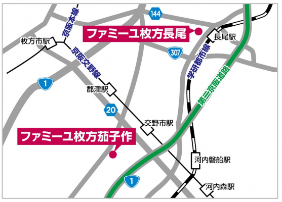 (地図)枚方市内のファミーユホールは2店舗での展開となる