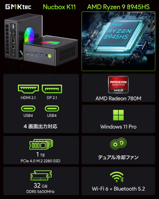 GMKtec NucBox K11は、AMD Ryzen(TM) 9 8945HSを搭載した高性能ミニPCです。8コア16スレッド、最大5.2 GHz動作の高性能CPUと32 GBの大容量メインメモリ、1 TBのM.2 PCIe 4.0 高速SSDを搭載することで画像や動画編集なども快適に行えます。HDMIとDisplayPort、USB4端子を組み合わせて最大4画面同時出力に対応し、在宅ワークのようなビジネスからプライベートまで、省スペースで生産性を最大限に高めることができます。