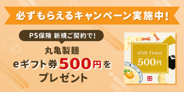 キャンペーン期間中に、ドコモスマート保険ナビ経由で「PS保険」を新規にご契約いただいたお客さまに「丸亀製麺 eギフト券 500円」をもれなくプレゼントします。