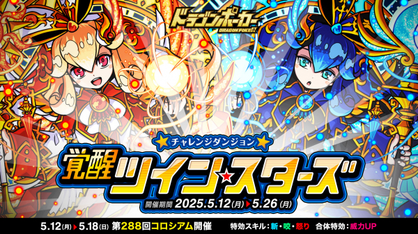 株式会社アソビズム(本社:東京都千代田区、代表取締役:大手智之)は、App Store・Google Playにて好評配信中のリアルタイム合体カードバトル『ドラゴンポーカー』で、2025年5月12日(月)よりチャレンジダンジョン「覚醒ツインスターズ」を開催いたします。