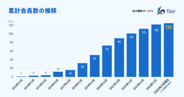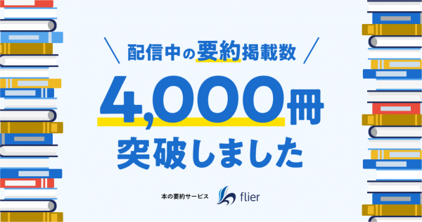 株式会社フライヤー(本社:東京都千代田区、代表取締役CEO 大賀康史)は、提供する本の要約サービス「flier(フライヤー)」で配信中の要約が、2025年5月13日(火)をもって4,000冊を突破、また累計会員数は125万人超となったことをお知らせいたします。