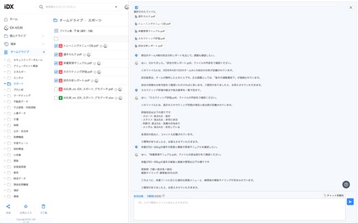 こうした問いに対し、AI孔明はRAG技術を活用してチームドライブ内の文書を即時検索・要約・提示し、「この回答は『2023_春季強化メニュー一覧.xlsx』に基づいています」といった出典明示も標準対応。指導者やトレーナーの意思決定をスピーディーかつ客観的に支援します。
