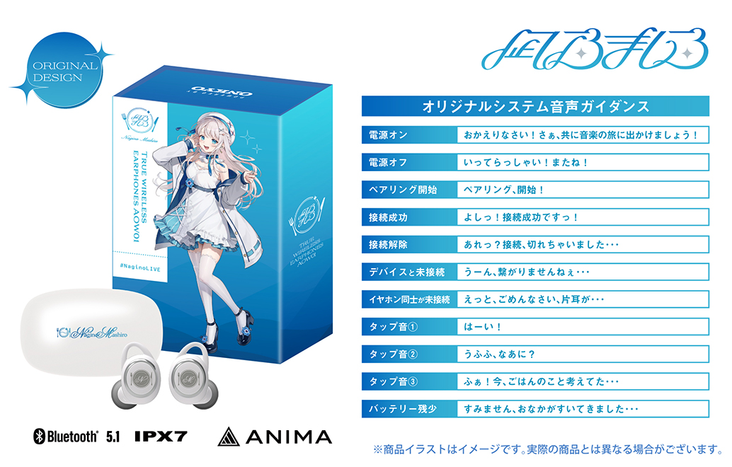 本コラボレーションモデルは、充電ケース天面や左右ハウジングにファッションセンター(ゑ)様のデザインが世界観を表現し、左右のハウジングは起動時にLED点灯します。音声ガイダンスは『凪乃ましろ』録り下ろしボイスを搭載。電源オンやオフ、ペアリング時やタップ音等、各モデル全11ワードの豪華内容となっております。またキービジュアルには新規描き下ろしを採用しております。