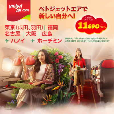 (東京, 2025年5月14日) - ベトジェットは2025年夏の旅行シーズンの幕開けを記念し、日本とベトナムを結ぶ全10路線でご利用いただける数百万枚もの航空券を、わずか11,690円(*)から提供するほか、受託手荷物が最大20kg無料となるキャンペーンを開催します。旅行体験をより充実させる様々な夏の特典も用意しており、これから旅行を予定している日本人旅行者の皆さまは、この機会にお得に航空券をお買い求めいただけます。