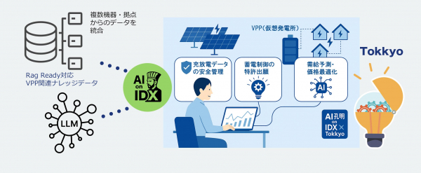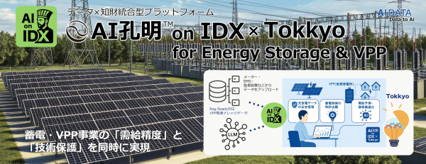 企業データとAIの利活用カンパニー、AIデータ株式会社(本社:東京都港区、代表取締役社長 佐々木隆仁、以下AIデータ社)は、蓄電池およびVPP(仮想発電所)関連事業者に向けて、「AI孔明 on IDX × Tokkyo for Energy Storage & VPP」の提供を開始します。本サービスは、分散型電源や需給調整の高度化を推進する蓄電/VPP事業において、データの安全管理・AIによる需給予測・制御技術の特許化までを一体で支援する次世代プラットフォームです。