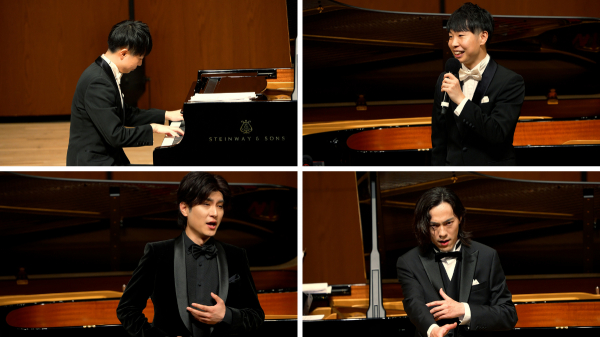 本コンサートのナビゲーターでメインピアニストでもあり、サントリーホールでのコンサートも大成功させたBudoによるオープニングナレーションで幕が上がると、東京藝大でともに声楽を学んだというREAL TRAUMのメンバーで、自身のYouTubeで公開した「鬼のパンツ」の動画が1,000万回を超える再生となった話題の鳥尾匠海と、劇団ポラリスやスタジオジブリのコンサートツアーなどでも活躍するオペラ歌手の仁賀広大によるデンツァ『フニクリ・フニクラ~鬼のパンツ~』で会場が大いに盛り上がった。