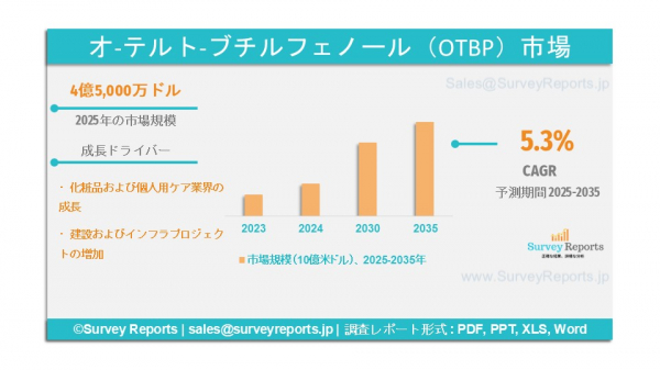 サーベイ・リポートズ・エルエルシーは、2025年5月に「O-テルト-ブチルフェノール(OTBP)市場セグメンテーション」に関する調査報告書を発行したことを発表しました。本報告書は、製品タイプ(ポータブル発電機、インバーター発電機)、出力(1,000ワット未満、1,000ワットから3,000ワット)、用途(キャンプおよびアウトドア活動、緊急用バックアップ電源)別に市場を分析しています。燃料タイプ別(ガソリン、ディーゼル);価格帯別(低価格帯($50未満)、中価格帯($50~$150))- グローバル市場分析、動向、機会、および予測、2025-2035年」を発表しました。この報告書は、O-テルブチルフェノール(OTBP)市場の予測評価を提供しています。このレポートでは、O-テルブチルフェノール(OTBP)市場における主要な市場動向、成長要因、市場機会、課題、および脅威を強調しています。