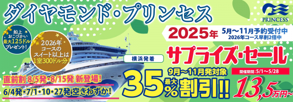 対象コース、対象キャビンが売り切れ次第終了となるセールです。上記以外でも、ダイヤモンド・プリンセス横浜発着クルーズは、6/4発、6/22発、7/1発、7/27発の直前割(フラッシュセール)と、2025年9~11月出発の最大35%割引サプライズ・セールをおこなっております。この機会にダイヤモンド・プリンセス日本発着クルーズでの優雅な船旅をお得にご予約ください!