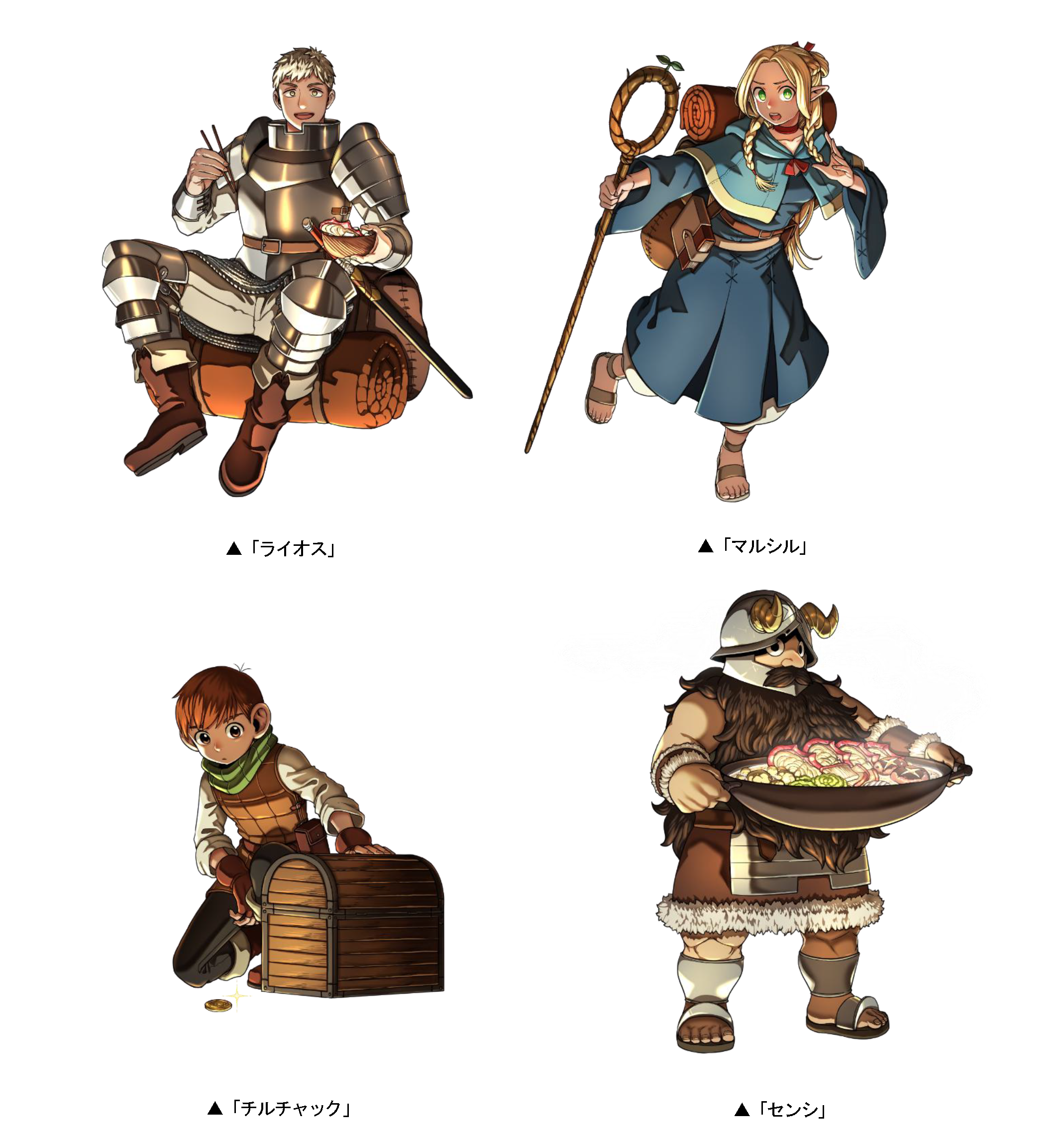 「ライオス」「マルシル」「チルチャック」「センシ」をはじめ、TVアニメ『ダンジョン飯』の人気キャラたちが登場!その他の登場キャラクターやイベント情報については特設サイトをご確認ください。