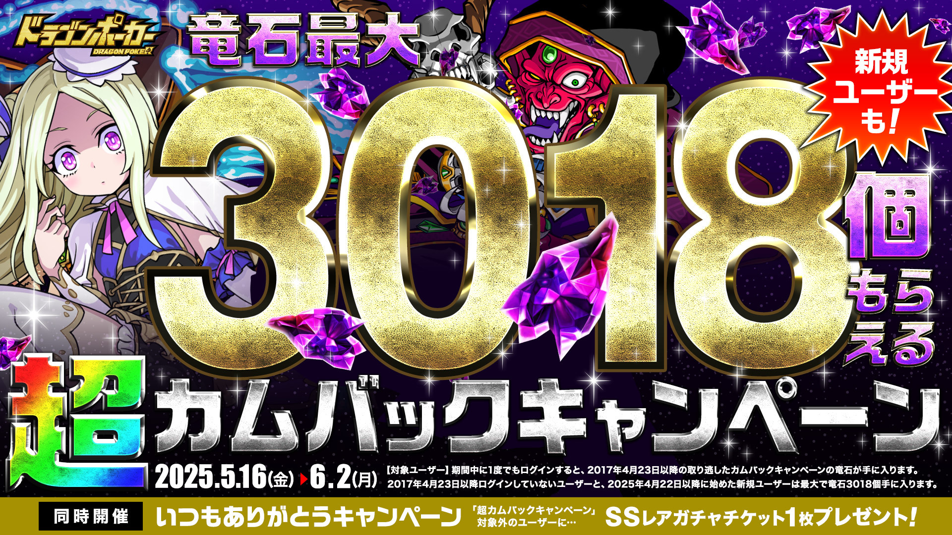 2017年4月23日以降に実施されたカムバックキャンペーンにて、ログインせずに受取れなかった竜石がまとめて手に入ります。2017年4月23日以降のカムバックキャンペーン期間中、ログインしていないユーザーに最大で竜石3018個をプレゼント!さらに、2025年4月22日以降にドラゴンポーカーを始めたユーザーにも竜石3018個プレゼント!これを機会に、ログインして大量の竜石をGETしましょう。また、いつも『ドラゴンポーカー』をプレイして頂いているユーザーの皆様には感謝を込めて、「SSレアガチャチケット1枚」をプレゼントいたします。