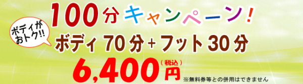 OPENキャンペーン第2弾 100分キャンペーン!はボディケア70分+フットケア30分の計100分セットメニューが6,400円(税込)とお得に受けられるキャンペーンです!
