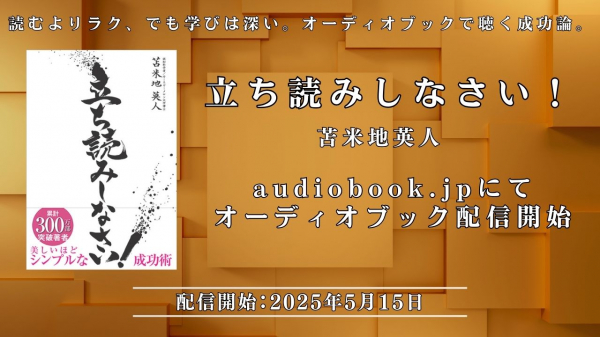 株式会社オトバンクと株式会社サイゾーは、2025年5月15日より、苫米地英人氏による書籍『立ち読みしなさい!~美しいほどシンプルな成功術』のオーディオブック版を、オーディオブック配信サービス「audiobook.jp」にて配信を開始いたしました。