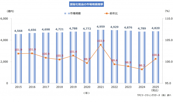 ◆頭髪化粧品市場は、コロナ禍の2020年も“おうち美容”需要に支えられ比較的安定な推移を維持していたものの、2021年以降は新興ブランドの台頭で競争が激化し、市場は停滞傾向に転じている。2024年の市場規模は、ヘアカラーにおける主要ブランドの不振や育毛市場での過当競争が要因となり、前年比1.8%減の4,789億円となった。