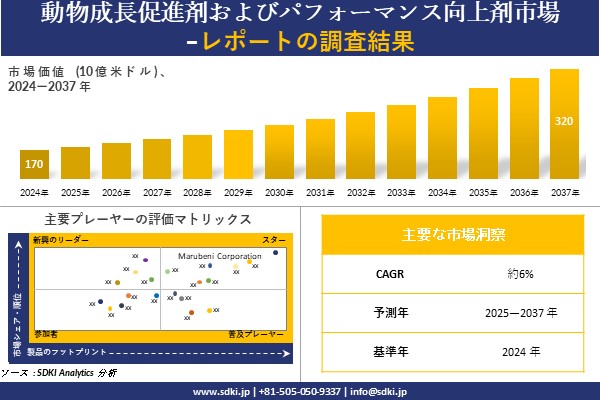 動物成長促進剤およびパフォーマンス向上剤市場に関する当社の調査レポートによると、動物成長促進剤およびパフォーマンス向上剤市場規模は 2037 年に約 320億米ドルに達すると予想されています。さらに、2024 年の 動物成長促進剤およびパフォーマンス向上剤市場規模は約 170億米ドルとなっています。動物成長促進剤およびパフォーマンス向上剤に関する市場調査レポートでは、市場は 2025-2037 年の予測期間中に約 6% の CAGR で成長するとも述べられています。