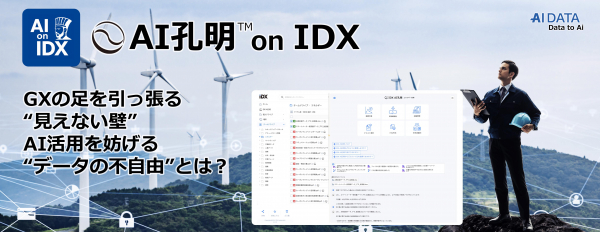 その一方で、設備データの散在やベンダーロックにより、AIの活用が思うように進まないという課題も顕在化しています。こうした“見えない壁”を乗り越えるために、企業データとAIの利活用カンパニー、AIデータ株式会社(本社:東京都港区、代表取締役社長 佐々木隆仁、以下AIデータ社)は、生成AIとデータ統合基盤を組み合わせたソリューション「AI孔明TM on IDX for GX」を提供開始します。