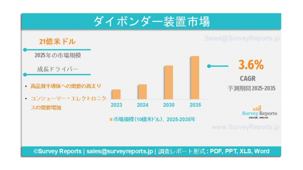 サーベイレポート合同会社は、2025年5月に調査レポート「ダイボンダ装置市場 タイプ別(手動ダイボンダ、半自動ダイボンダ、全自動ダイボンダ)、接合技術別(エポキシ、共晶、ソフトはんだ、その他); デバイス別(オプトエレクトロニクス、MEMSおよびMOEMS、パワーデバイス)、用途別(家電、自動車、産業、通信、ヘルスケア、航空宇宙・防衛、その他) - ダイボンダー装置市場の予測評価を提供する世界市場分析、動向、機会、予測、2025-2035年です。ダイボンダー装置市場の成長促進要因、市場機会、課題、脅威など、いくつかの主要な市場ダイナミクスを紹介しています。