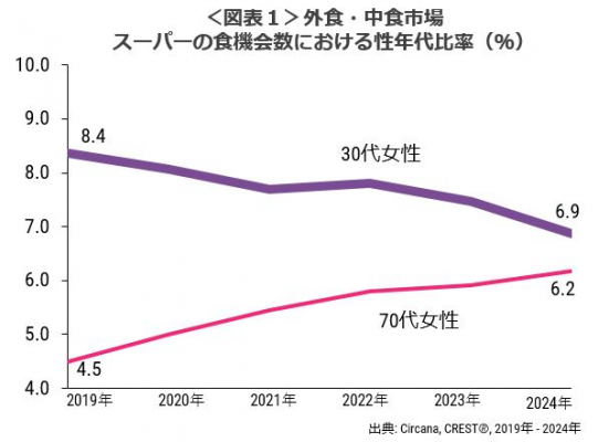 「業態選択型定型主要指標レポート」は、 業態毎の利用者・利用シーンを捉え、その中でどのようなセグメントが伸びているのか、主要指標を6年分の年計トレンドで把握することができるレポートです。スーパーを選択した同レポートより、外食・中食におけるスーパー利用者の性年代比率(食機会数比率%)を2019年から2024年までの6年分時系列でみると(図表1)、女性30代は2019年に8.4%を占めましたが、2024年には6.9%と大きく減少しました。一方で、2019年に同4.5%だった女性70代が、2024年に6.2%と大幅に比率が増加しました。