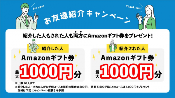 期間中、ご紹介者様・ご紹介された方の双方に、Amazonギフト券(最大1,000円分)を進呈します(※プラン契約内容により金額が異なります)。