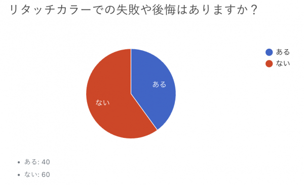 「リタッチカラーでの失敗や後悔はありますか?」の回答は、“ある”が40%、“ない”が60%となりました。