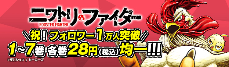 株式会社 ヒーローズ(本社:東京都千代田区、代表取締役社長:白井勝也)は、弊社から刊行している『ニワトリ・ファイター』(著:桜谷シュウ)の公式Xアカウント(@niwatorifighte1)のフォロワー数が1万人を突破したことを記念して、2025年5月22日(木)から5月28日(水)まで、「祝!フォロワー1万人突破! 『ニワトリ・ファイター』28円セール!!」を各電子書店で開催いたします。