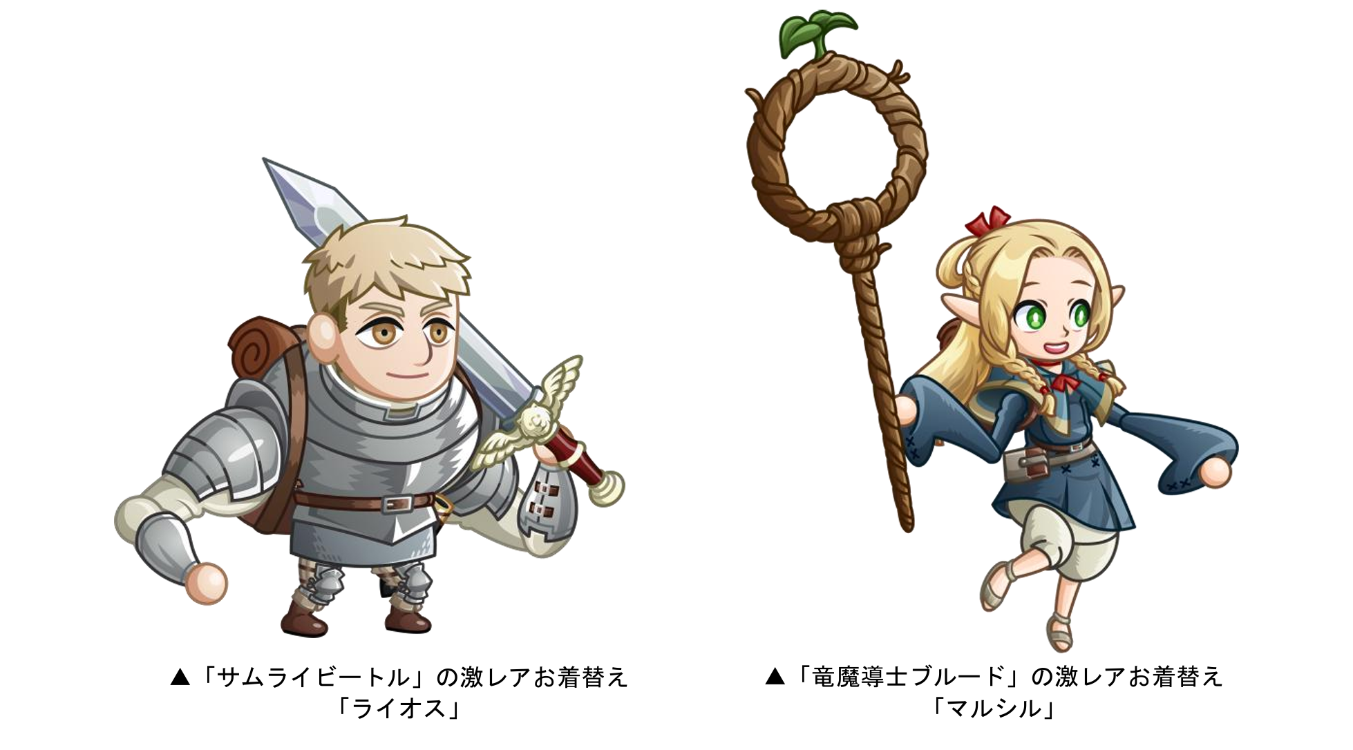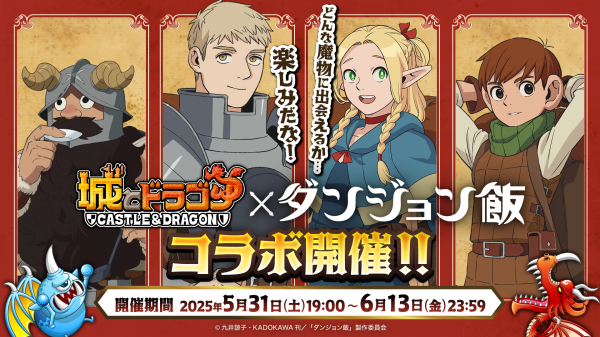 5月31日(土)より『城とドラゴン』にて、TVアニメ『ダンジョン飯』との初のコラボイベントを開催することが決定しました。コラボ限定の城ドラキャラの新しい激レアお着替えとして「ライオス」や「マルシル」などが登場するほか、コラボ限定キャラも登場!詳細は近日、城とドラゴン公式YouTubeチャンネルでお伝えいたします。なお5月23日(金)からは「コラボ直前!フォロー&リポストキャンペーン」をXにて実施しますので、ぜひこの機会をお見逃しなく!