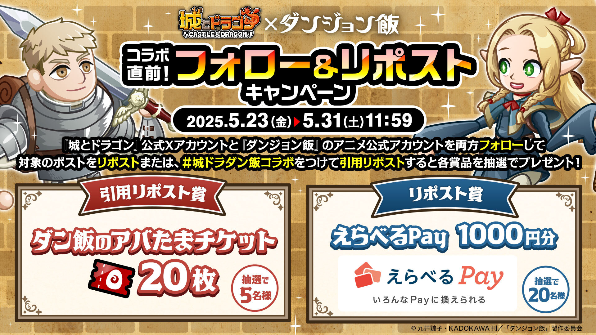 コラボ開催を記念して、「コラボ直前!フォロー&リポストキャンペーン」を実施いたします。『城とドラゴン』公式Xアカウント(@shirotodoragon)と『ダンジョン飯』のアニメ公式Xアカウント(@dun_meshi_anime)を両方フォローし、キャンペーン対象ポストを公式リポスト、またはハッシュタグ「#城ドラダン飯コラボ」をつけて引用リポストされた方の中から抽選で各賞品をプレゼント!ぜひ引用リポストする際はハッシュタグとあわせて、「コラボイベントが発表された時の感想」や「コラボイベントの楽しみにしているポイント」などもコメントしてみてください!