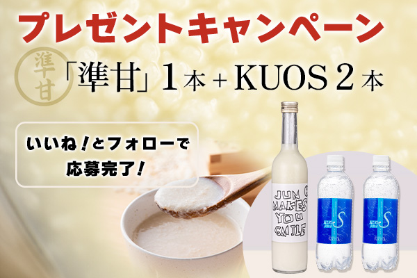 キャンペーン期間中に応募された方の中から抽選で、5名様に『米麹甘酒 準甘1本』とKUOSシリーズ『強炭酸水KUOSプレーン2本』セットをプレゼントします。