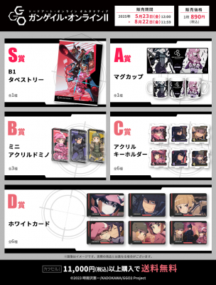 S賞はアニメキービジュアルを使用した、大迫力の「B1タペストリー」。その他の賞もTVアニメ『SAO オルタナティブ ガンゲイル・オンラインII』の世界観を存分にお楽しみいただるグッズが盛り沢山の魅力的な賞品ラインナップとなっております。