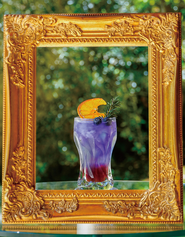 バタフライピー・ラベンダーティーにグレープフルーツとハーブ香るシロップを合わせた一杯。ローズマリーが糸杉、オレンジチップが月を象ります。混ぜることで夜明けの色への変化を楽しめるモヒートスタイルです。