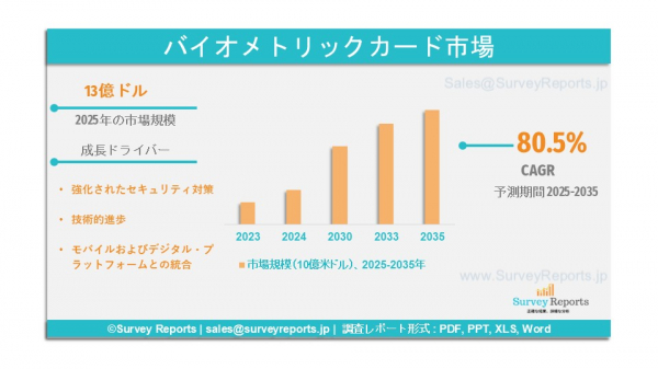 Survey Reports LLCは、2025年5月に「生体認証カード市場セグメンテーション(用途別:支払い、アクセス制御、政府発行の身分証明書、金融包摂、その他の用途);認証技術別(指紋認識、顔認識、虹彩認識、音声認識、署名認識);カードタイプ別(磁気ストライプカード、スマートカード、非接触型カード、ハイブリッドカード)」に関する調査報告書を発行しました。販売チャネル別(直接販売、小売店舗、オンラインプラットフォーム、第三者販売業者);エンドユーザー業界別(BFSI、小売、政府、医療、商業企業、その他のエンドユーザー業界)- グローバル市場分析、動向、機会、および予測、2025-2035」を発表しました。この報告書は、生体認証カード市場の予測評価を提供しています。本レポートでは、生体認証カード市場の主要な市場動向、成長要因、市場機会、課題、脅威など、複数の重要なポイントを強調しています。