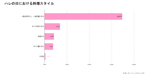 長子2歳以上の子を持つ女性に、日常の料理スタイルについて質問すると、「ほとんど毎日手作りしている」と回答した家庭と、「手作りと購入を組み合わせている」と答えた家庭が、それぞれ約半数ずつ存在した。一方、「ハレの日の料理」においては、「一部は手作りし、一部は購入する」と回答した家庭が約70%を占めたのに対し、「すべて手作りする」と回答した家庭は13%にとどまった。「ハレの日の料理」を用意した祝い事としては、「子どもの誕生日」が最も多く約80%、「お食い初め」が約65%、「クリスマス」が約64%と続く。このように、祝い事に対する「気持ちの表現」としての食事が重視されている。そのほか、ハレの日の料理や演出に子どもが関わった割合は約8割、情報源はInstagramが最多という結果になった。