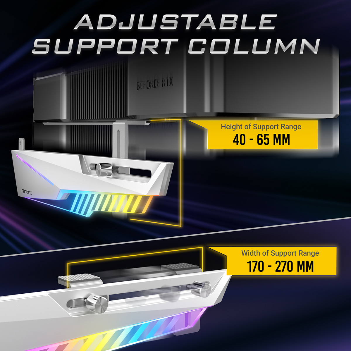 GPUの空いている隙間に固定出来るので、大きいGPUを下からしっかりと支える事ができます。調整はネジ式になっており幅は170-270 mmまで対応、高さは40-65 mmまで対応しています。3PIN ARGB SYNCに対応しておりマザーボード又はコントローラーを介して光制御に対応しています。NVIDIA Geforce RTX、AMD Radeonなど各種GPUに対応しています。