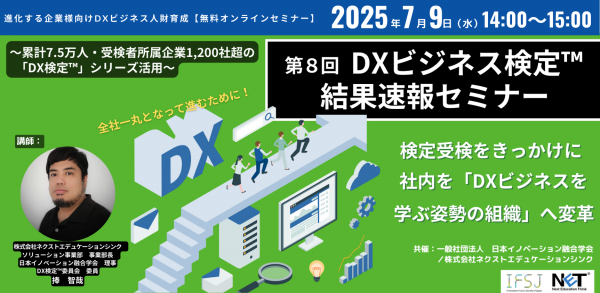科学的なデジタル技術を駆使して、スキル・コンピテンシーアセスメント、教育研修、組織人財分析コンサル専門の教育サービスベンチャーの株式会社ネクストエデュケーションシンク(略称:NET)(本社:東京都文京区、代表取締役:斉藤実)は、日本の企業競争力を左右するDX推進人財の育成と、その最新動向を明らかにし、「DXをビジネス変革の手段として捉え、自社のビジネスモデルを変革・創造し推進できる人財」の育成の第一歩となるDXビジネス人財育成事例をご紹介する、『第8回DXビジネス検定(TM)』結果速報セミナーを2025年7月9日(水)に開催します。